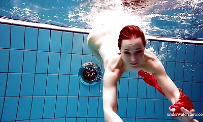 Adorable babe in red sexy open dress swimming